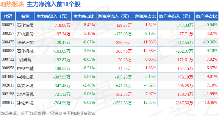 从资金流向上来看,当日地热板块主力资金净流出9124.4万元,游资资金净流出611.3万元,散户资金净流入9735.7万元。地热板块个股资金流向见下表:
