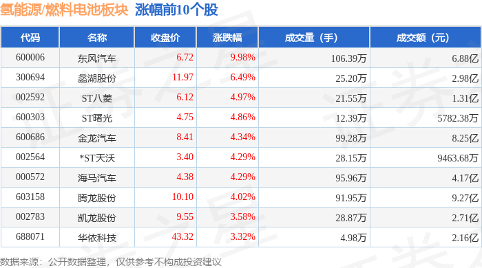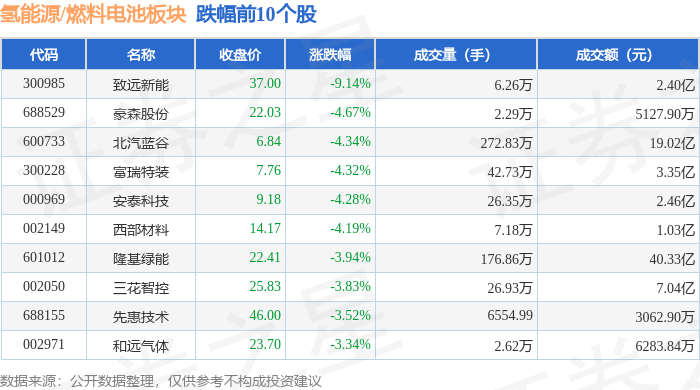从资金流向上来看,当日氢能源/燃料电池板块主力资金净流出18.36亿元,游资资金净流入3.34亿元,散户资金净流入15.02亿元。氢能源/燃料电池板块个股资金流向见下表: