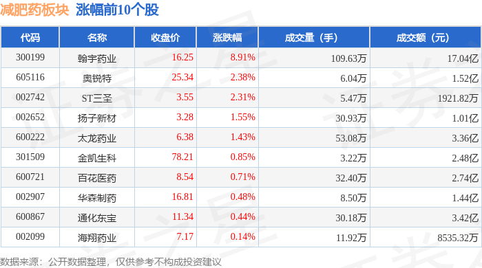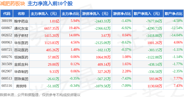 从资金流向上来看,当日减肥药板块主力资金净流出3.37亿元,游资资金净流出9079.24万元,散户资金净流入4.27亿元。减肥药板块个股资金流向见下表:
