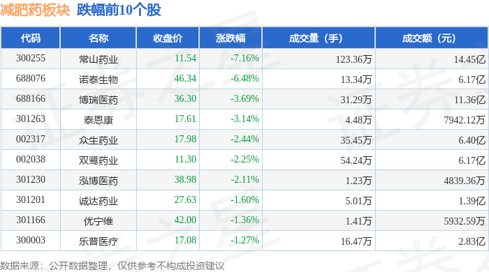 证券之星消息,11月2日减肥药板块较上一交易日下跌0.47%,常山药业领跌。当日上证指数报收于3009.41,下跌0.45%。深证成指报收于9734.77,下跌0.94%。减肥药板块个股涨跌见下表: