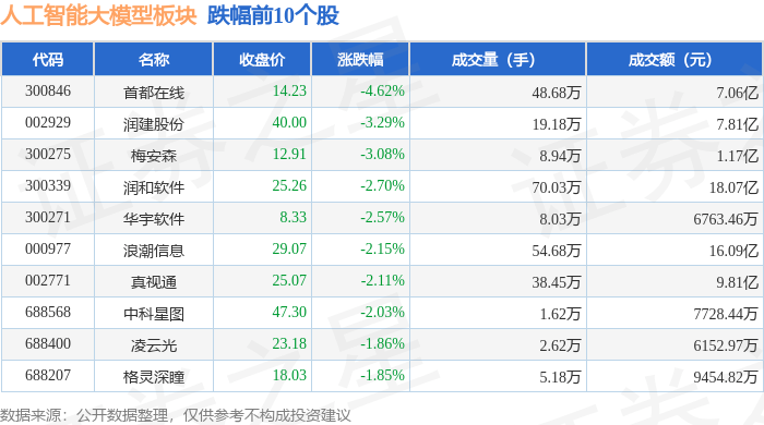 证券之星消息,11月2日人工智能大模型板块较上一交易日下跌0.4%,首都在线领跌。当日上证指数报收于3009.41,下跌0.45%。深证成指报收于9734.77,下跌0.94%。人工智能大模型板块个股涨跌见下表: