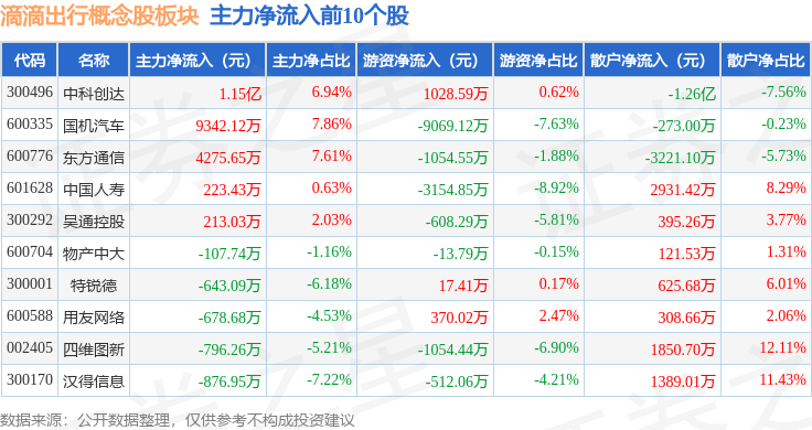 从资金流向上来看,当日滴滴出行概念股板块主力资金净流入689.55万元,游资资金净流出8142.66万元,散户资金净流入7453.1万元。滴滴出行概念股板块个股资金流向见下表: