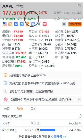 截至收盘,苹果(AAPL)报177.57美元,涨幅2.07%,市值2.8万亿美元。财报公布后,苹果美股盘后一度跌超4%。