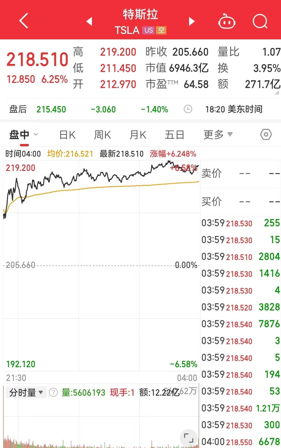 截至当地时间11月2日收盘,特斯拉(TSLA)报218.51美元,涨幅6.25%,市值6946.3亿美元。