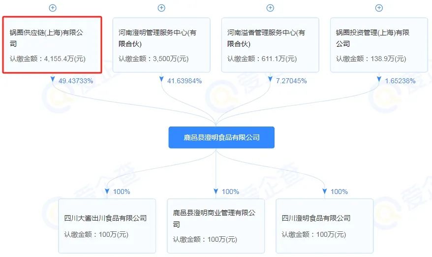锅圈创始人杨明超虽发迹于郑州,但并未忘本。2019年,他在老家鹿邑投资了鹿邑县澄明食品有限公司,注册资本为5555.6万元,背后控股大股东正是锅圈,占74.79%的股份,杨明超担任董事长和实控人。