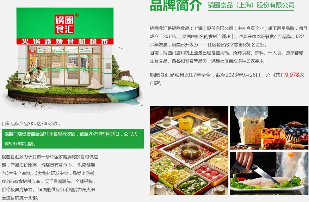 官网显示,锅圈成立于2017年,是中国领先的一站式在家吃饭餐食产品品牌,提供即食、即热、即煮和即配食材。最新数据显示,截至2023年10月11日,锅圈已经构建起了由10025家品牌门店形成的零售终端网络。截至2023年4月30日,锅圈的注册会员数量达到了2240万。