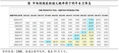 根据CME观察显示,截至11月1日,市场预期美联储在12月大概率不加息,此后维持高利率水平到明年6月;市场预期美联储大概率在明年6月首次降息。