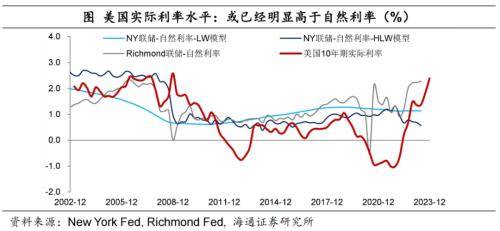 另一方面,美国的实际利率水平或已足够高。我们在此前的报告《5%的美债利率:是否偏高了?》中指出,当前2.5%附近的美债实际利率是否太高,可以去和自然利率去做对比,因为自然利率是经济和通胀达到稳定状态时的利率水平。
