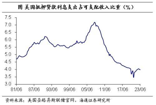 关于经济,韧性十足。美联储主席鲍威尔指出,经济的韧性表现让人意外。美联储在本次会议中没有将衰退重新纳入预测中。此外,美国公布的3季度GDP环比折年率高达4.9%,其中消费是最主要的贡献。我们此前在报告《美国持续加息:消费为何还稳定?》中指出,美联储大幅加息后,美国消费依然稳定输出与多方面的因素影响。主要是因为美国居民家庭净资产大幅增值、财政扩张致使美国居民税负大幅下降以及债务负担仍处低位,这一定程度上与美国2023年财政扩张以及货币政策滞后效应还未体现有关。