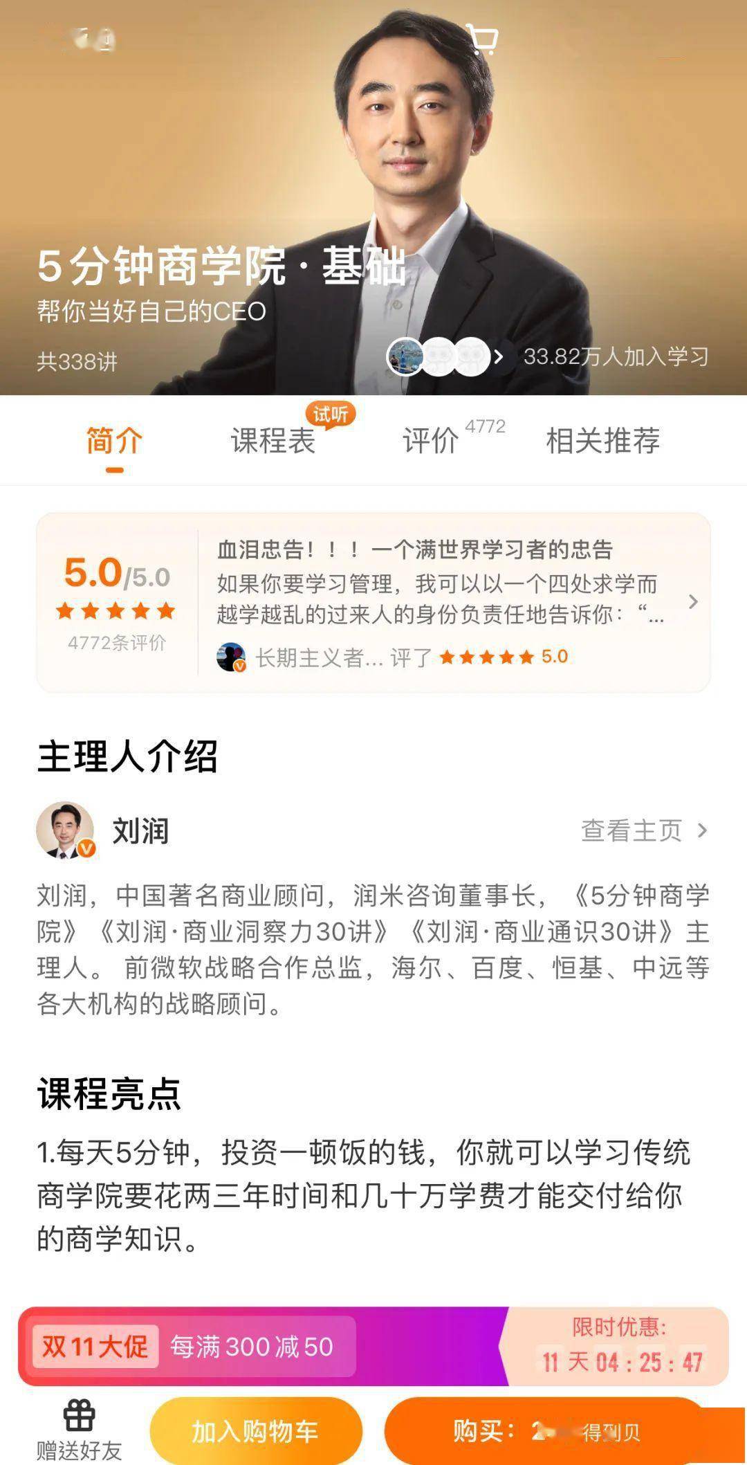 刘润在得到中开设的《5分钟商学院·基础》、《5分钟商学院·实战》、《商业洞察力30讲》和《商业通识30讲》几门课,售价分别为249元、199元、99元和99元;页面显示,四种课程分别有33.82万人、21.46万人、12.74万人和7.5万人学过。