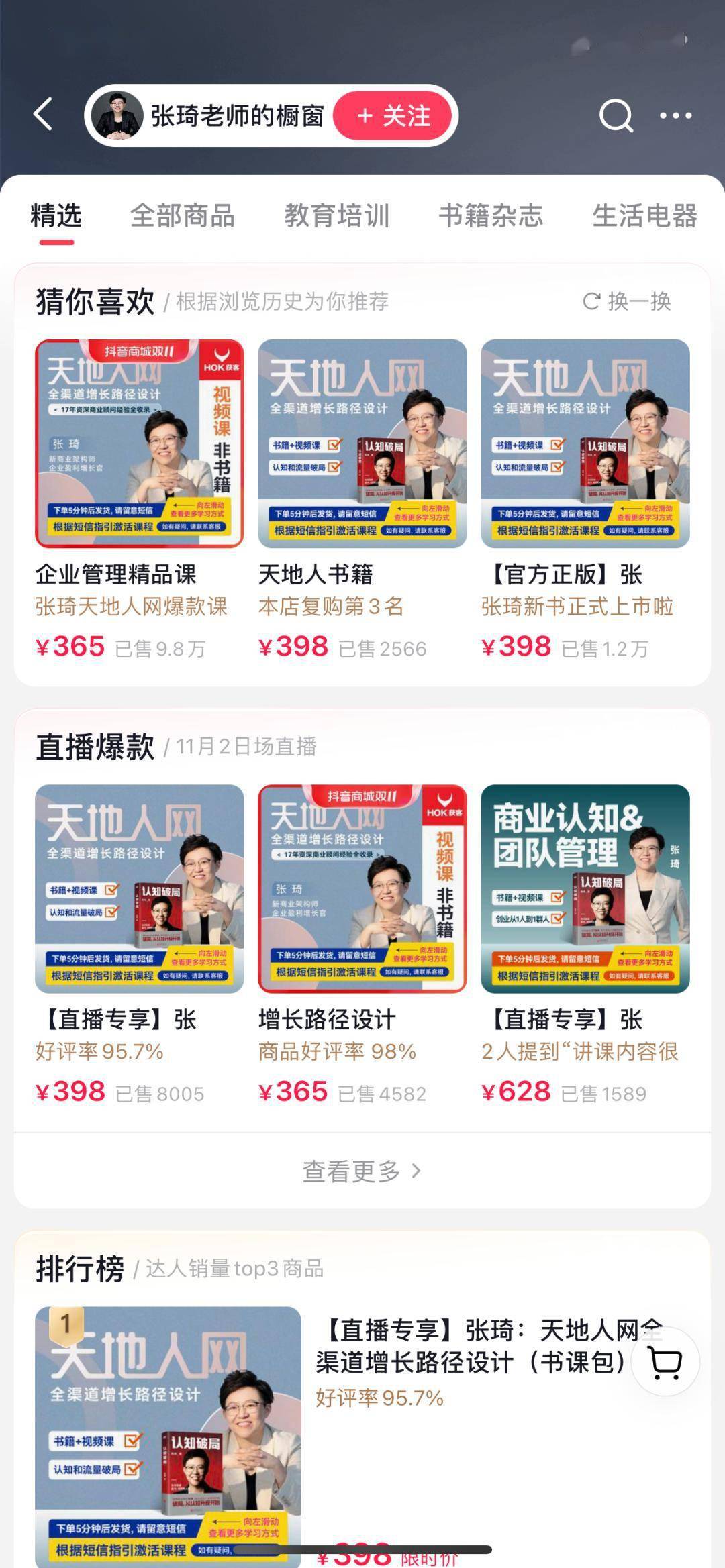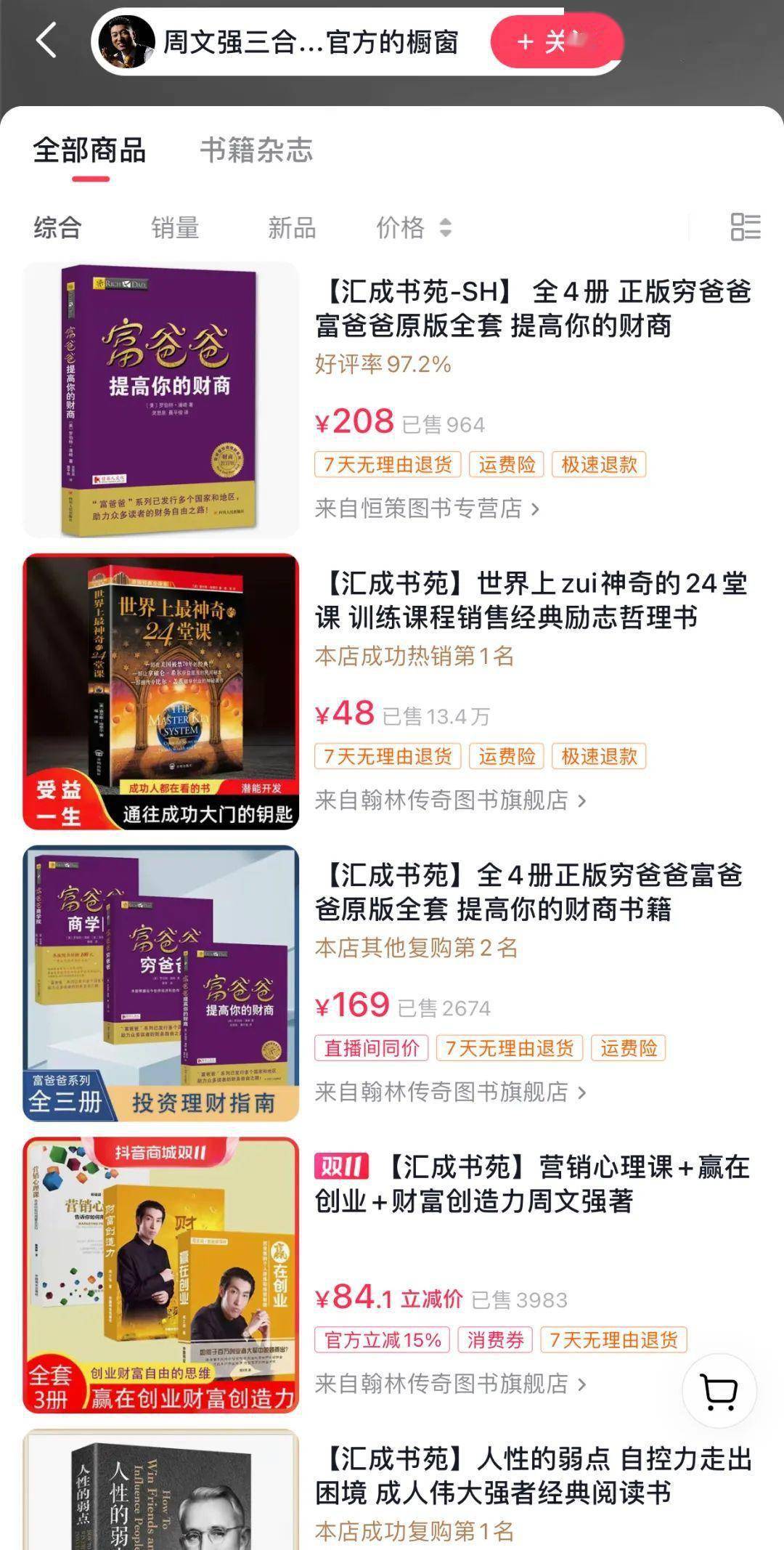 周文强也打造了众多矩阵账号,并且在售各种书籍,每种书售价从几百到几十不等,销量少则几千,多则十几万。笔者粗略计算,周文强橱窗中的商品销售额至少超过1000万元。