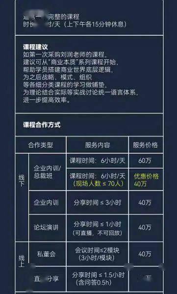 根据刘润方面发布的课程宣传海报显示,几种不同形式的线下企业课程,售价40万或者60万不等;而线上形式的几种课程售价40万元。