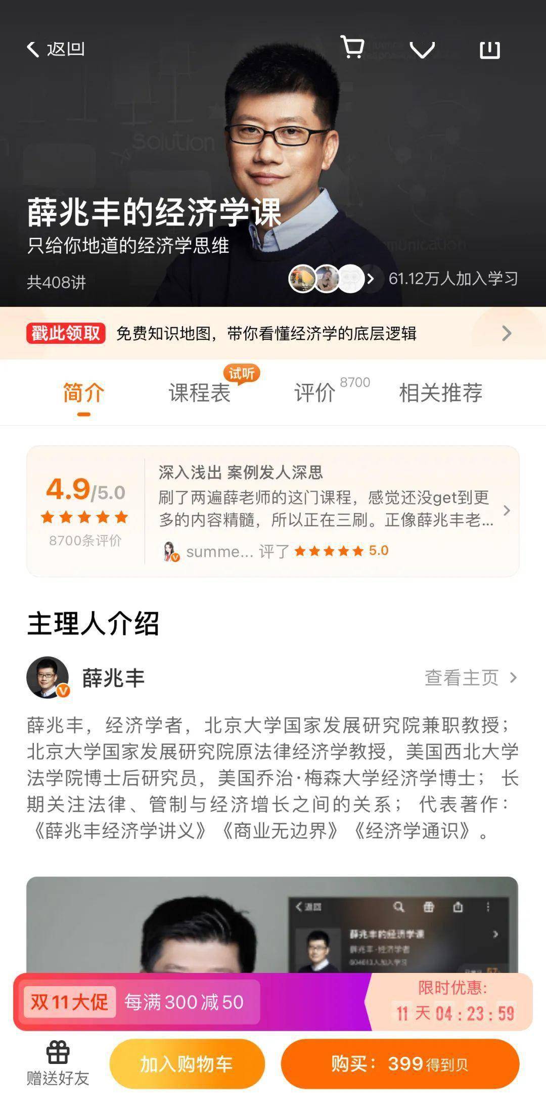 薛兆丰也是得到的知名专栏作者,他在得到上开设的《薛兆丰的经济学课》,售价399元,目前已经有超过60万人学习过。