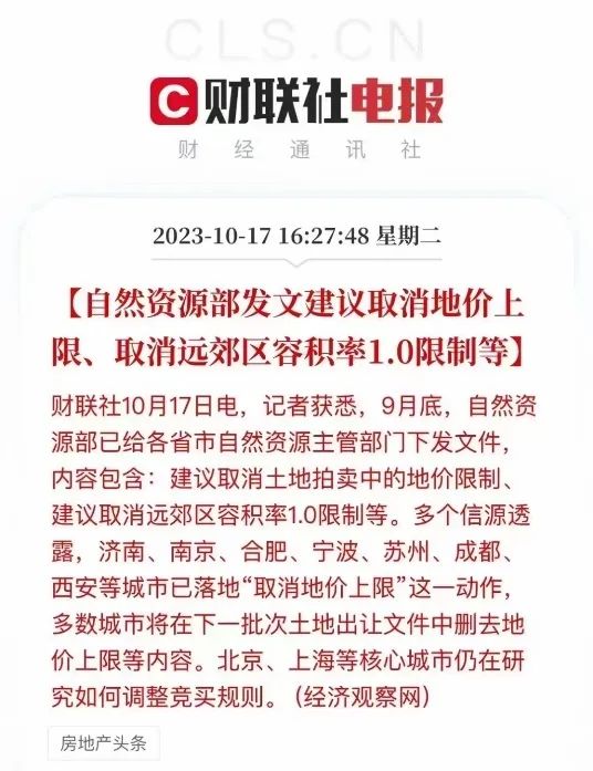 最近,财联社和经济观察网同步发布消息,内容包含:建议取消土地拍卖中的地价限制、建议取消远郊区容积率1.0限制等。