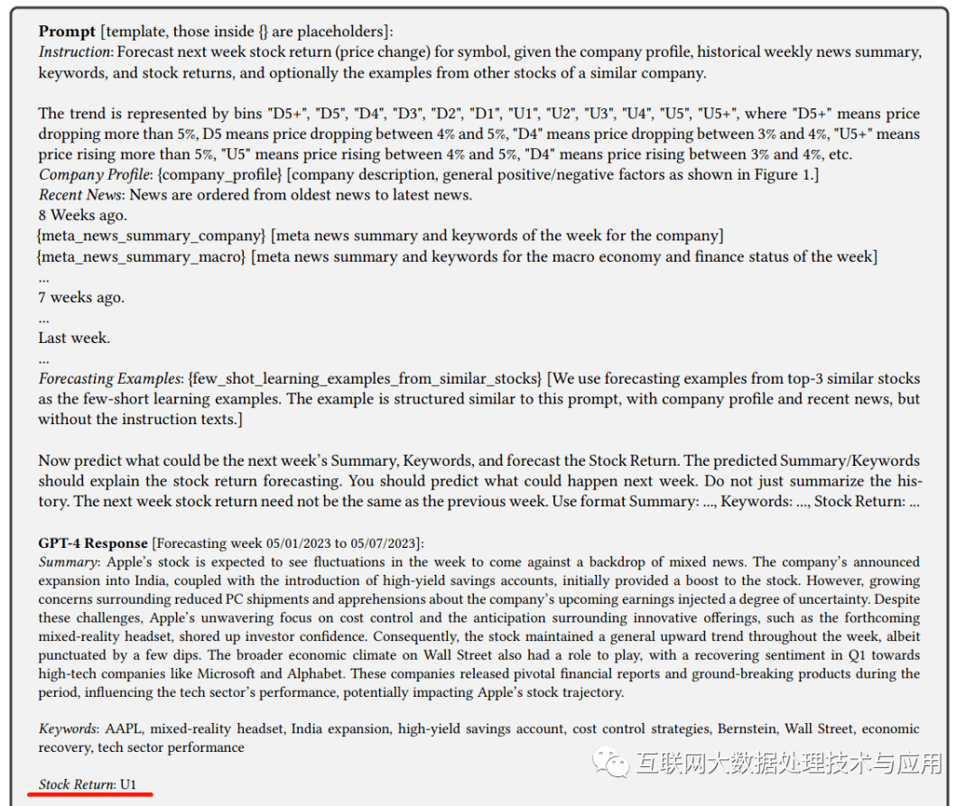 纳斯达克NASDAQ-100股票(包括高通、苹果、谷歌等)+历史价格数据+公司元数据+历史经济金融新闻。处理方法是,价格数据转换成为收益率,量化为若干个桶(bin)并用Dx,Ux标注。桶的数量取决于预测精度要求。使用GPT4生成公司描述文本,以及对公司股价有影响的正负面因子,看起来是一般性描述,与日期没有关系。(图1)
