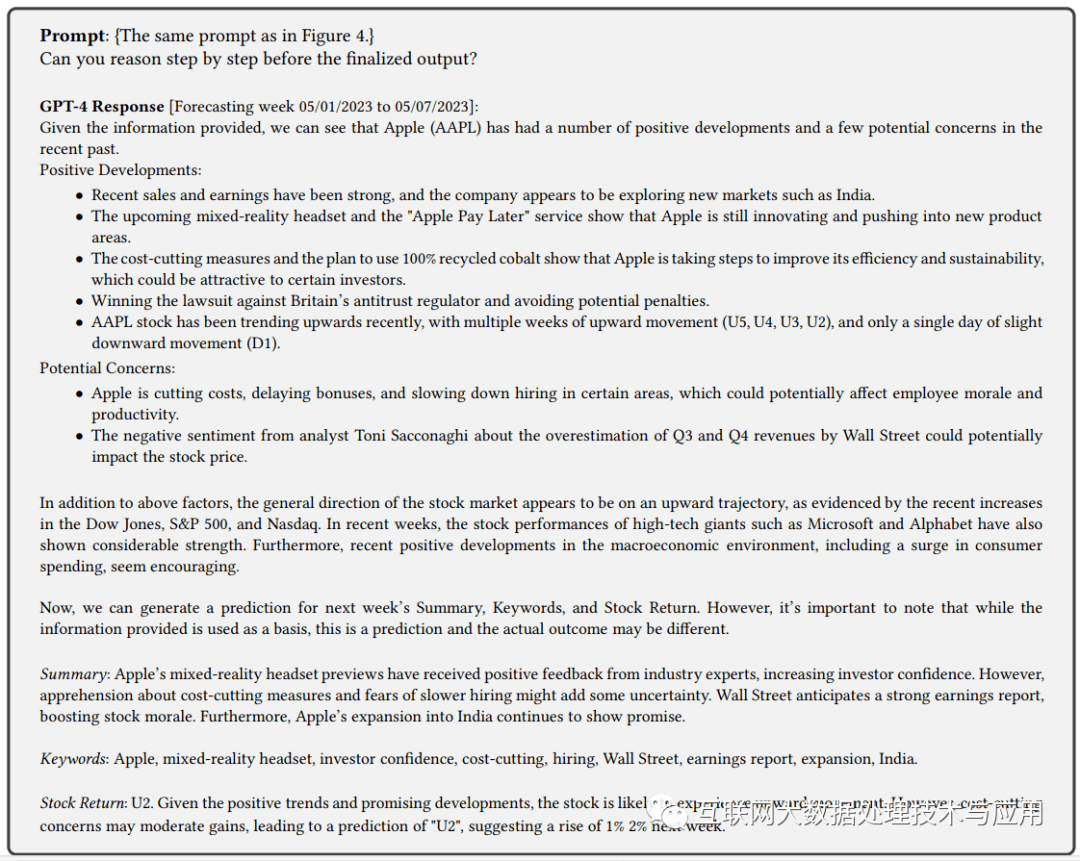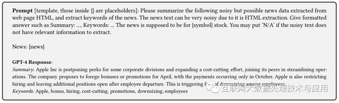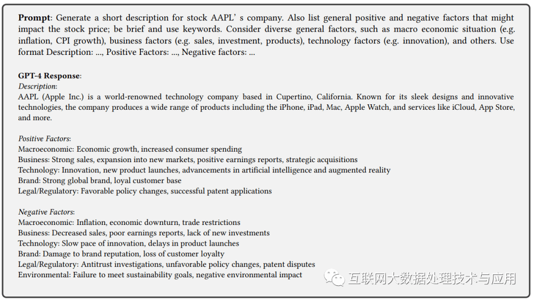 使用Google搜索引擎API获得上市公司一周内的前5个新闻,并使用GPT-4生成摘要和关键词(图2)。对于每周的宏观经济和金融新闻也采用类似方法获得摘要和关键词。