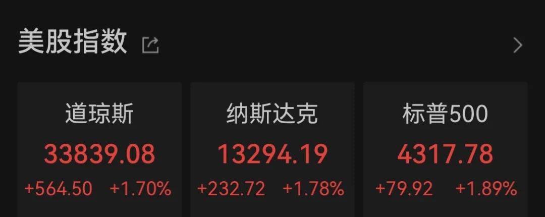 道指涨564.50点,涨幅为1.70%,报33839.08点;纳指涨232.72点,涨幅为1.78%,报13294.19点;标普500指数涨79.92点,涨幅为1.89%,报4317.78点。