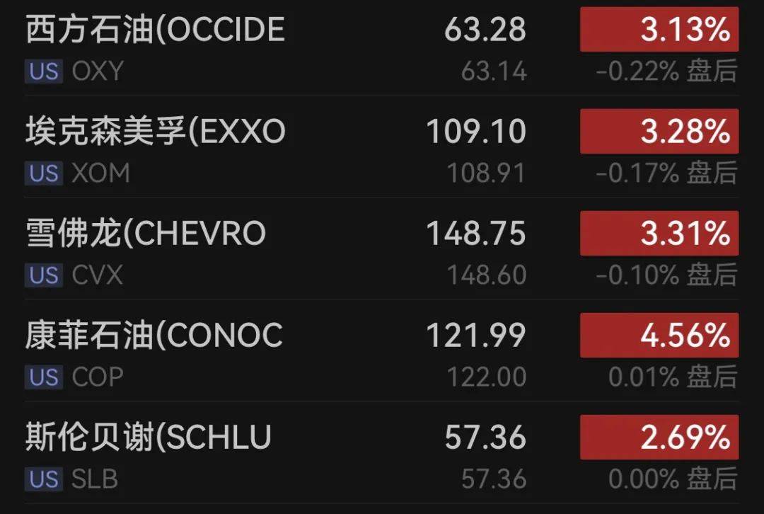 能源股全线上涨,埃克森美孚涨3.28%,雪佛龙涨3.31%,康菲石油涨4.56%,斯伦贝谢涨2.69%,西方石油涨3.13%。