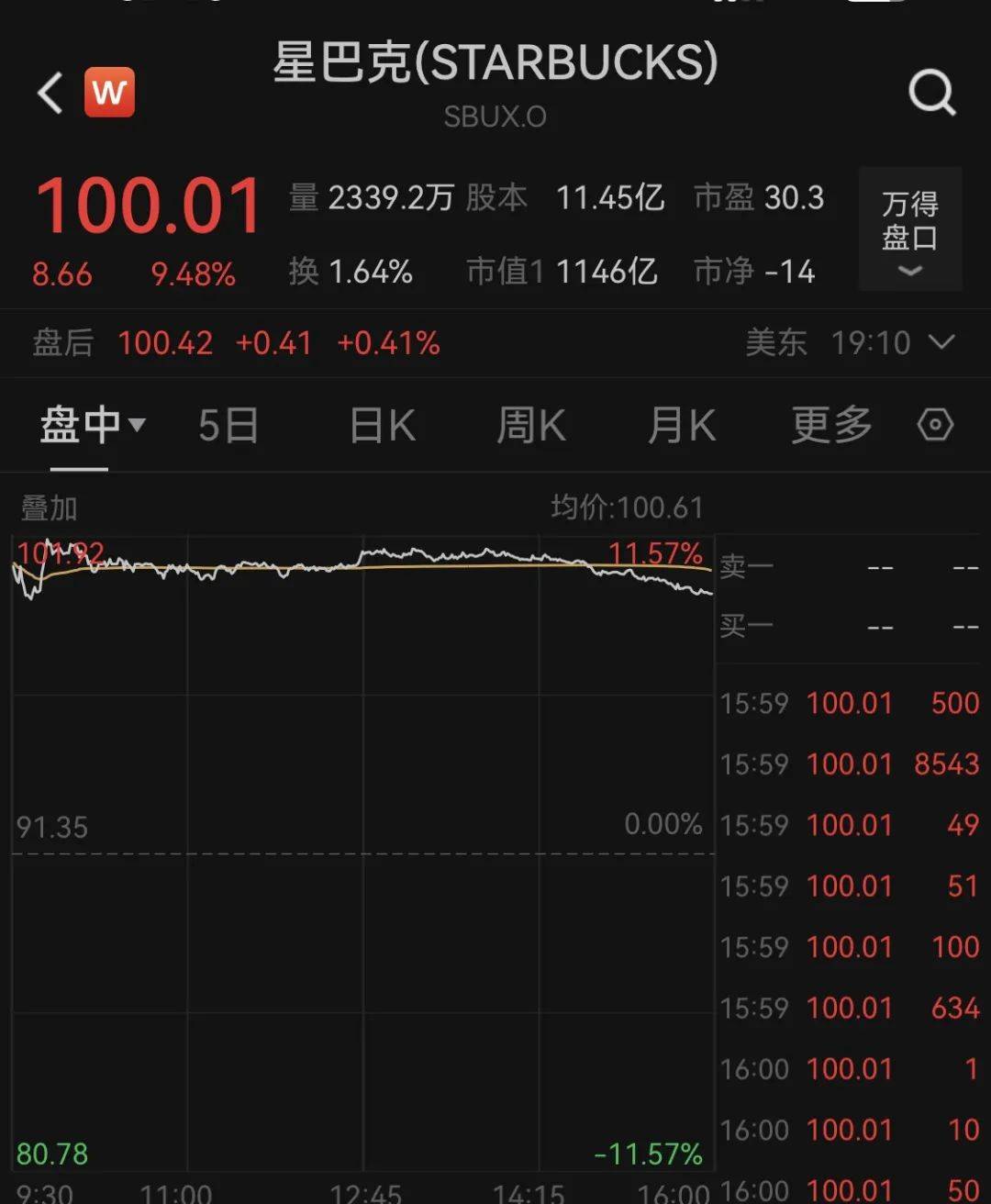 星巴克股价周四收高9.48%,报100.01美元/股。