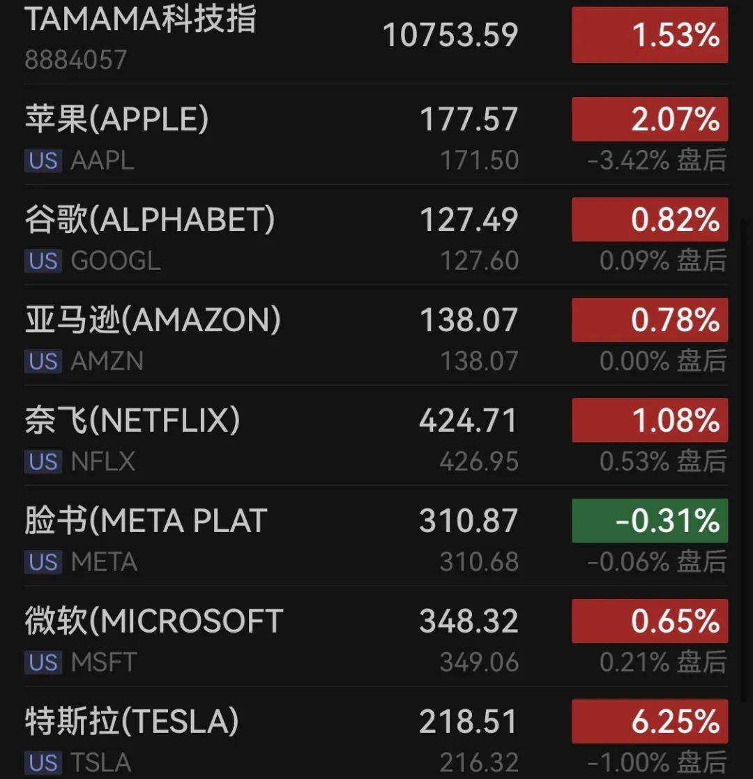 科技股周四多数上涨,万得美国TAMAMA科技指数涨1.53%,特斯拉涨6.25%,苹果涨2.07%,亚马逊涨0.78%,奈飞涨1.08%,谷歌涨0.82%,脸书跌0.31%,微软涨0.65%。