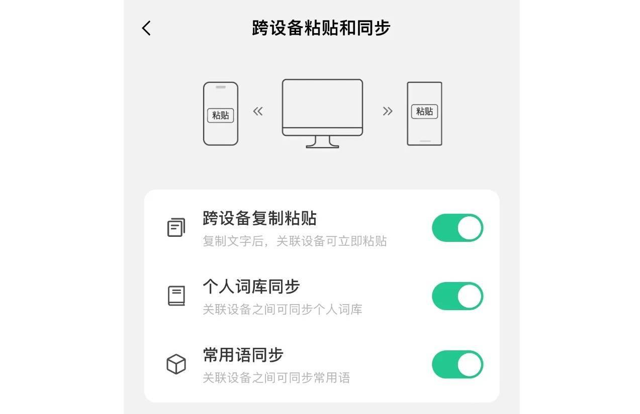更新后支持跨设备复制粘贴文字、同步词库和常用语,同时优化体验并修复问题。
