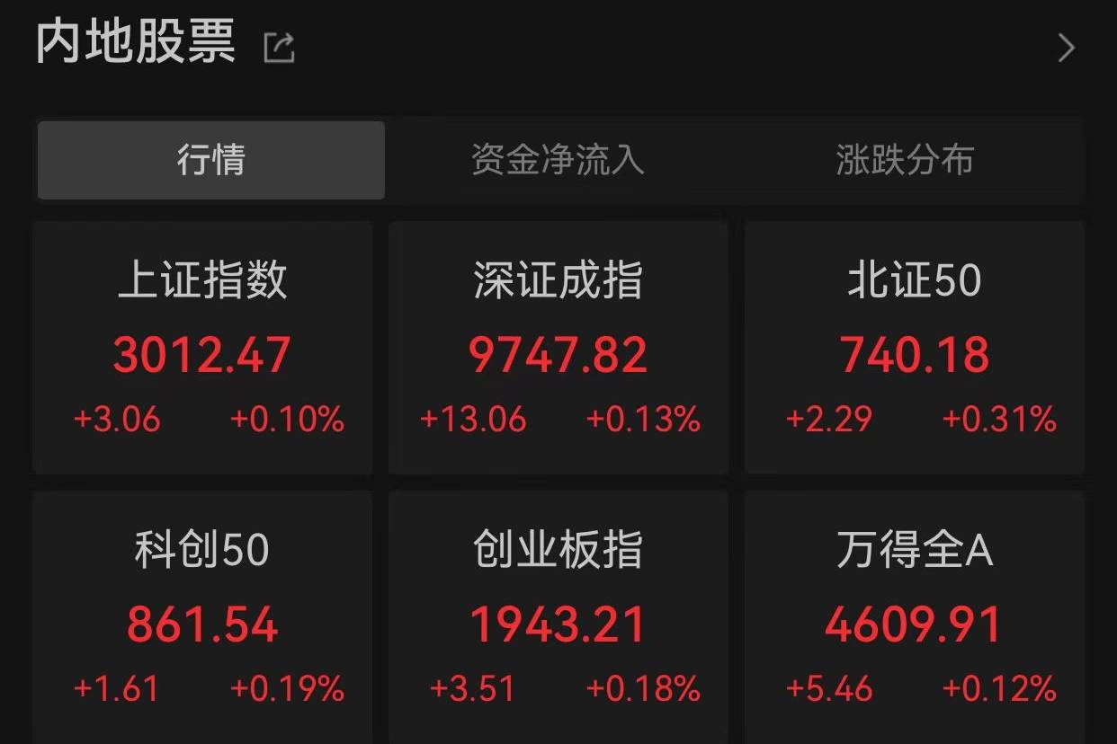 中新经纬11月3日电 3日早盘,A股三大指数小幅高开。上证指数涨0.10%,报3012.47点;深证成指涨0.13%,报9747.82点;创业板指涨0.18%,报1943.21点。