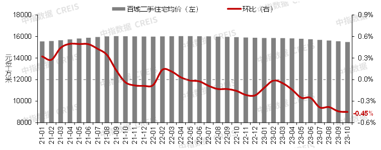 根据《百城价格指数报告》,10月,百城新建住宅平均价格为16195元/平方米,环比上涨0.07%,涨幅较9月扩大0.02个百分点;同比跌幅收窄至0.02%。百城二手住宅平均价格为15486元/平方米,环比下跌0.45%,跌幅较9月扩大0.01个百分点,已连续18个月环比下跌;同比跌幅扩大至2.88%。