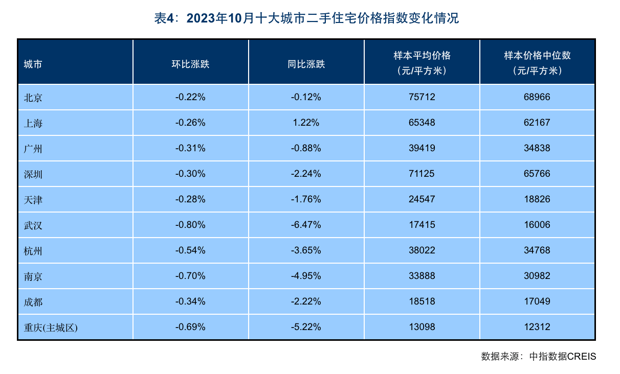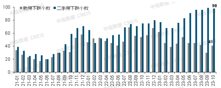 从房价涨跌城市数量看,根据中国房地产指数系统百城价格指数,10月,百城新建住宅价格环比下跌城市数量为41个,较9月增加11个。百城二手住宅价格环比下跌城市数量为98个,已连续5个月超90城,二手房市场深度调整态势仍在持续。