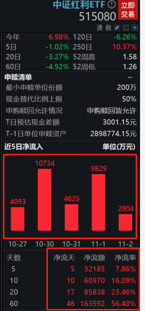 2023年11月3日,两市持续回暖。截至10时48分,中证红利ETF(515080)强势翻红涨0.07%,此前一度跌0.21%;成分股康力电梯、中联重科领涨。资金近期持续活跃,截至11月2日,该基金获资金连续14日净流入,累计约7.5亿。年初以来份额、规模双双增长超3倍!最新规模约44亿,在全市场同标的ETF中规模居首。
