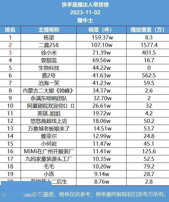 【直播带货日榜】是鞭牛士和三言科技推出的多个平台达人每日直播带货榜单。根据第三方数据平台“三眼查”提供的数据,鞭牛士将对快手、抖音平台的达人带货交易量、GMV、播放量进行统计和分析,以供各位从业者参考。