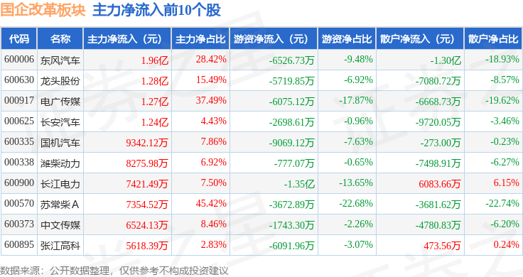 从资金流向上来看,当日国企改革板块主力资金净流出41.58亿元,游资资金净流出4.62亿元,散户资金净流入46.2亿元。国企改革板块个股资金流向见下表:
