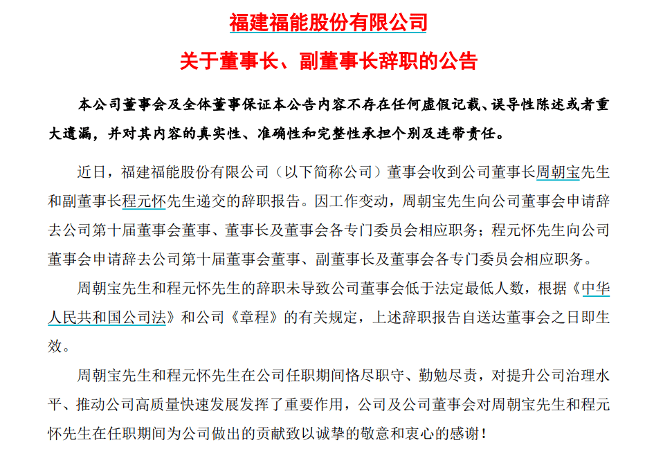据中国基金报11月2日消息,11月2日晚间,福能股份发布公告称,公司董事会收到公司董事长周朝宝、副董事长程元怀递交的辞职报告。与此同时,还有5位高管也申请辞职,包括公司总经理、副总经理等人。
