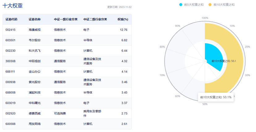 数据显示,截至2023年11月2日,该指数前十大权重股包括海康威视、韦尔股份、科大讯飞、中际旭创、金山办公等,前十大权重股合计占比约为50.1%。(数据来源:中证指数公司,指数成份股不代表个股推荐)