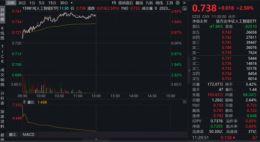截至2023年11月3日中午收盘,人工智能ETF(159819)强势反弹,收涨2.50%,盘中一度涨近3%,半日成交额达1.26亿元。与此同时,云计算ETF (516510)收涨2.44%,软件30ETF (562930)收涨2.40%。