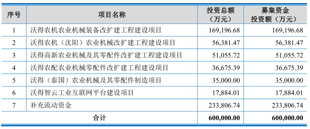 以沃得农机为例,作为农业机械领域的龙头企业,公司募资60亿对应的估值水平参考同行业公司属于合理范围,且募投项目均以实现拓展海外市场等未来发展规划为目标,具有合理性。招股书显示,沃得农机本次募集资金投向如下: