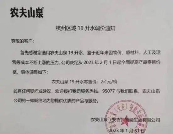 2023年新年假期刚结束不久,农夫山泉打响行业开年“涨价第一枪”,宣布调整杭州区域19L桶装水价格,自2月1日起,该产品由20元/桶上调至22元/桶。