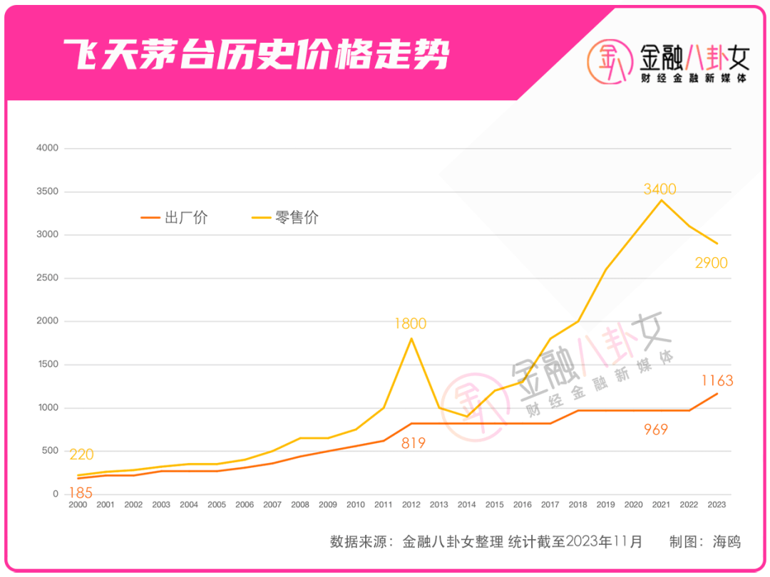 而2018年的提价,出厂价从819提到969,终端零售价提高到1499,这个价格引领了茅台再上一层,零售价一度涨到3400左右。