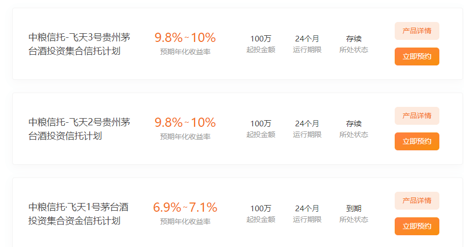 这可太赚了,于是,2019年,中粮信托又发布了2个亿的茅台投资信托计划,利率水平还提高到了9.8%-10%: