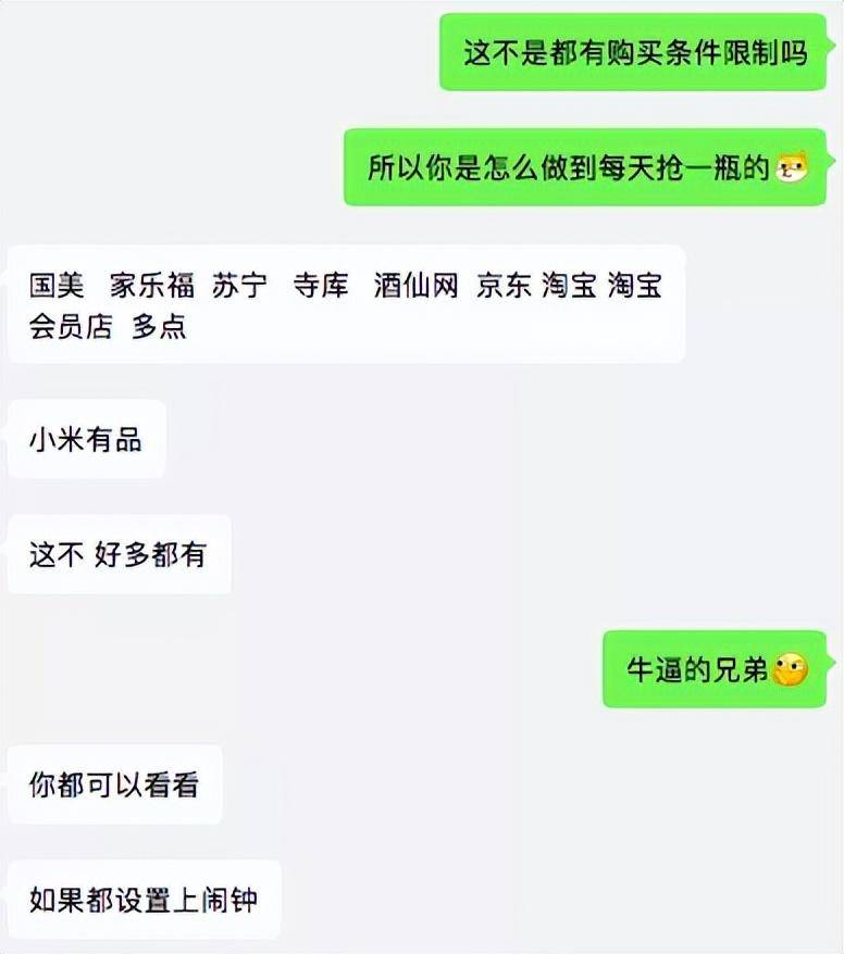 而线上的门槛相对较低,中签率就更低了,写外挂每天早上蹲点赚大钱的黄牛们,就是靠这些渠道抢酒: