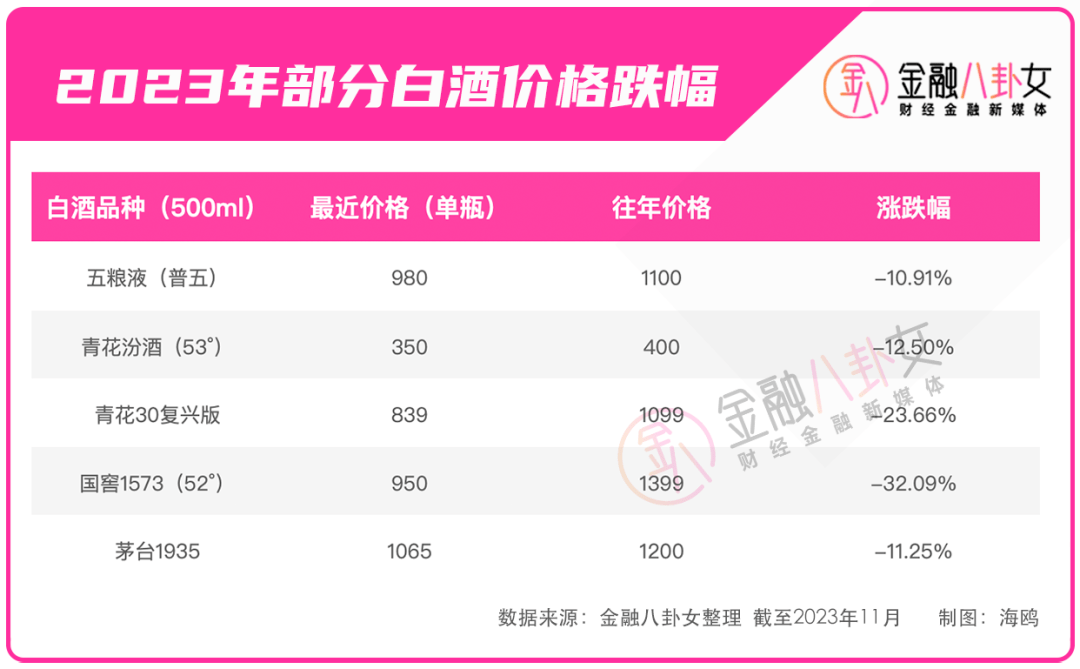 老二冷,老三老四老五老六就更没戏了,商贸公司给出的价格,各大白酒的市价都在跌,最多的国窖1573跌了三成: