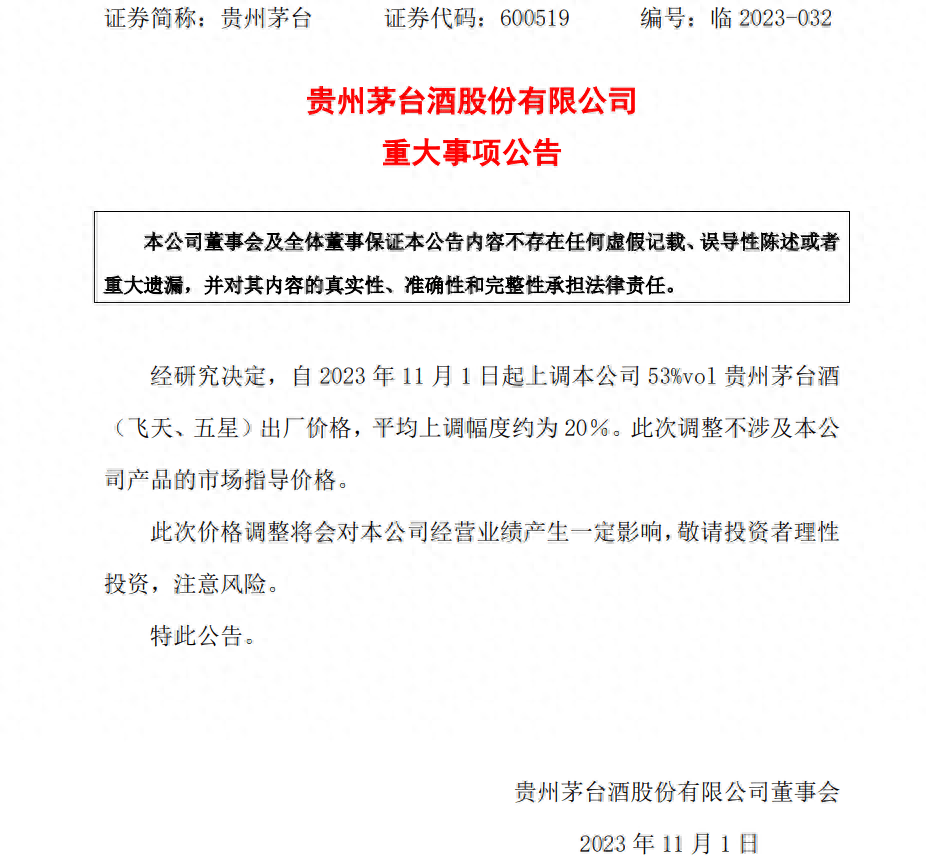 毫无征兆,贵州茅台突然发布了公告,宣布将飞天、五星的出厂价格提高20%。