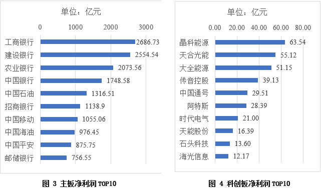 从各板块创收创利的头部上市公司来看,今年前三季度头部上市公司的表现十分抢眼。其中,主板净利润排名前3上市公司分别为工商银行、建设银行、农业银行,其净利润分别达到2686.73亿、2554.54亿、2073.56亿;科创板净利润排名前3上市公司分别为晶科能源、天合光能、大全能源,净利润分别达63.54亿、55.12亿、51.15亿;创业板净利润排名前3上市公司分别为宁德时代、迈瑞医疗、阳光电源,净利润分别达325.16亿、98.36亿、73.31亿;北交所净利润排名前3上市公司分别为贝特瑞、同力股份、连城数控,净利润分别达15.11亿、4.42亿、4.10亿。各版块净利润TOP10的上市公司也都表现出了较好的业绩,为中国经济发展注入了新动力。