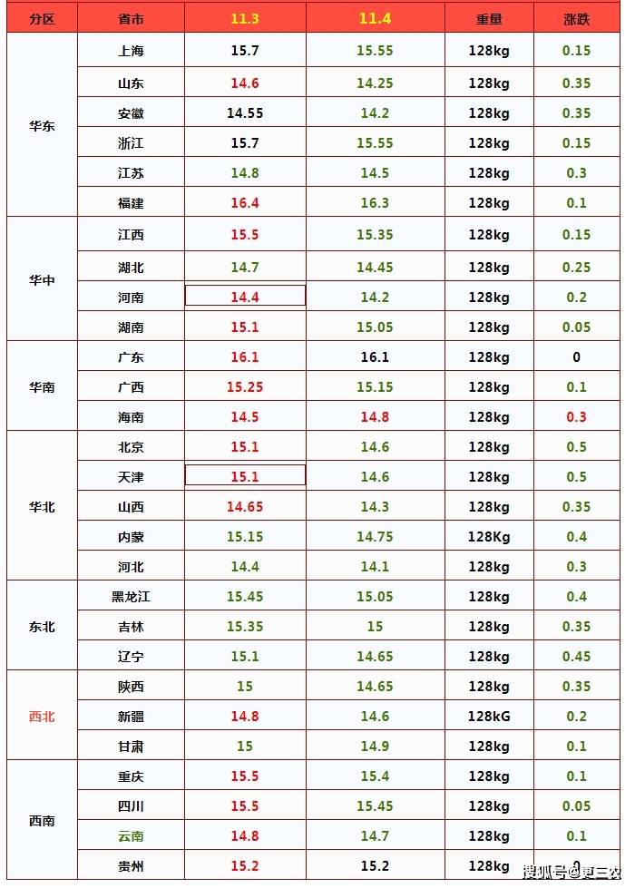在生猪市场,据机构汇总数据分析,11月4日,猪价“跳水”,价格结束了连涨的走势,国内外三元猪价跌至14.95元/公斤,价格下挫0.2元/公斤,市场呈现普遍下跌的走势!
