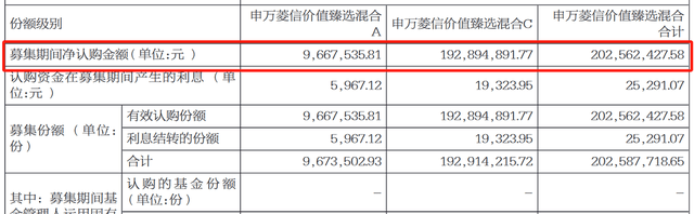 根据基金成立公告,申万菱信价值臻选A份额和C份额合计募集资金为2.03亿元,基金刚刚好满足了不低于2亿元的成立条件。其中,基金C份额募集达1.93亿元。