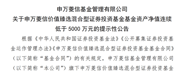 而在2023年8月15日,申万菱信基金发布的公告显示,截至2023年8月14日末,申万菱信价值臻选净资产已经连续30个工作日净资产低于5000万元。