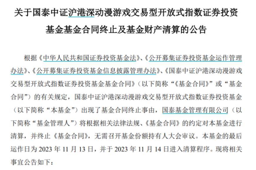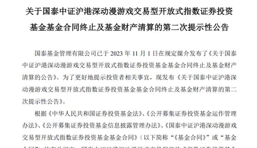 11月3日、11月2日,国泰基金发布关于旗下国泰中证沪港深动漫游戏ETF的基金合同终止及基金财产清算的第二次、第一次提示性公告。国泰基金表示,根据基金合同相关规定,国泰中证沪港深动漫游戏ETF出现了基金合同终止事由,公司将对该基金进行清算,并终止《基金合同》,无需召开基金份额持有人大会审议。基金的最后运作日为11月13日,并于11月14日进入清算程序。