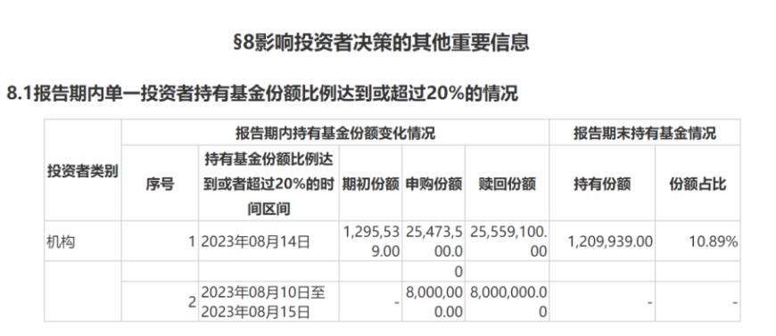 具体来看,2位机构投资者在三季度出现持有份额占比超过20%的情况。其中,机构1在8月14日申购2547.35万份,随后又赎回2555.91万份,三季度末仍持有120.99万份,占比超10%;而机构2在8月10日至8月15日,申购800万份又全部赎回,截至三季度末未持有任何基金份额。