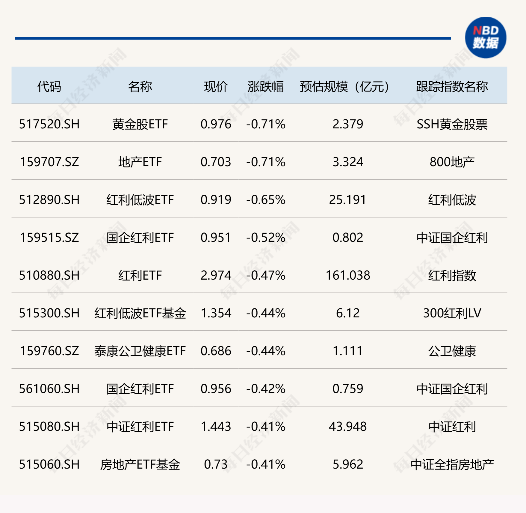 下跌方面,黄金股、地产、红利等相关ETF跌幅居前。