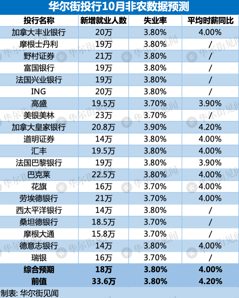 主要投行对10月新增非农人数的预测依旧分歧巨大,包括摩根士丹利在内的17家大型投行最低预测14万,最高预测23万。失业率与时薪同比增速的预期值相差不大。具体如下: