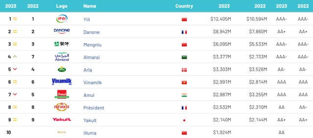 此前,国际品牌价值评估机构Brand Finance发布了“2023全球最具价值乳品品牌10强”榜单,伊利以124亿美元品牌价值位列第一位,品牌价值较去年增长17%,连续四年位居全球乳业第一。